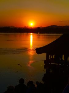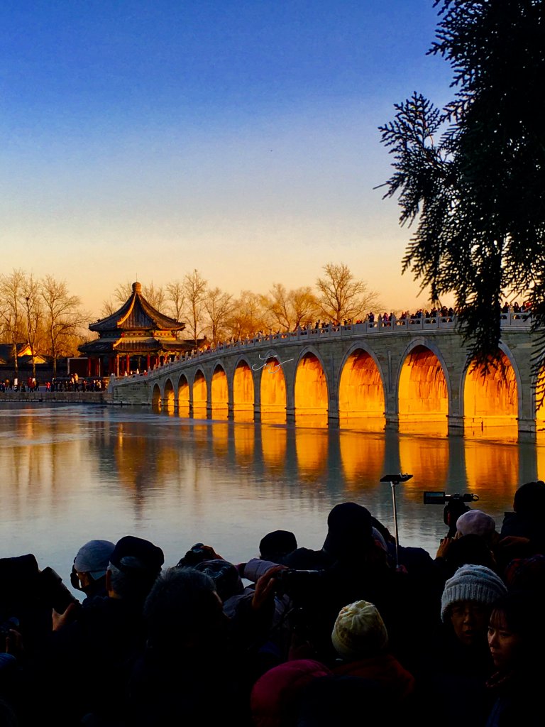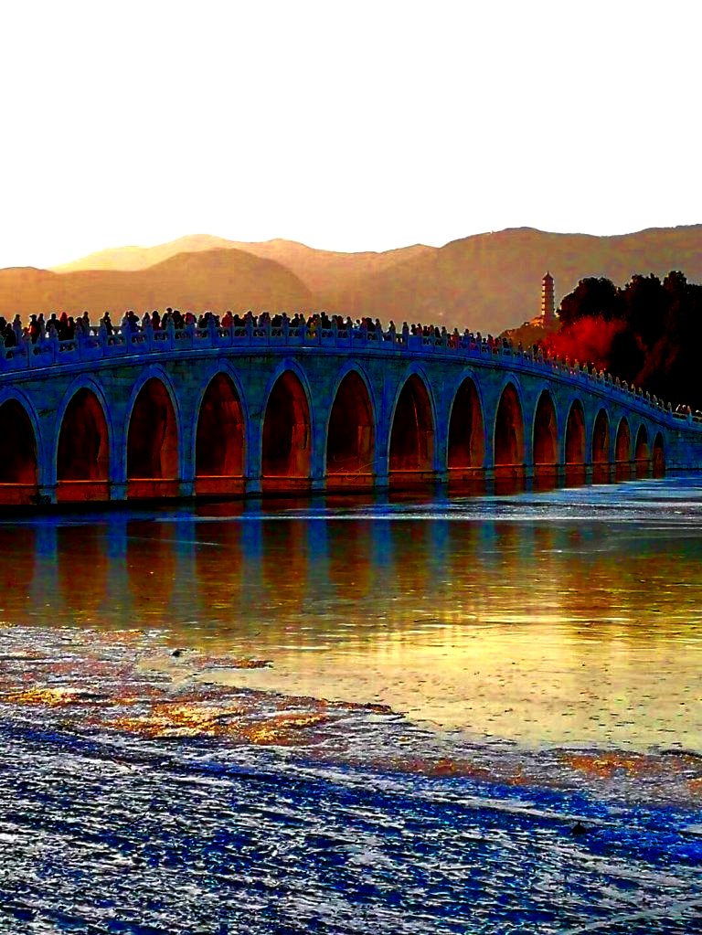 据说当年【颐和园】十七孔桥的建造者精心设计,将南回归线的落日与十七孔桥成垂直状态,因此当夕阳西下时,阳光最大程度的洒满十七孔桥的每个桥洞,并出现金光穿洞的奇特景观