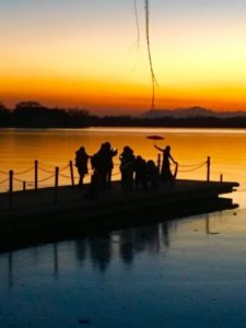 日落时分,借着落日余晖,北京颐和园十七孔桥附近呈现稍纵即逝的“金光穿洞”美景。